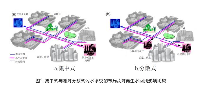 ①集中建設(shè)大規(guī)模污水處理系統(tǒng)具有較大的系統(tǒng)風險性,適度分散的污水處理系統(tǒng)不但提升了整個城市的排水系統(tǒng)總體韌性與可靠性,同時也有利于高品質(zhì)再生水作為城市第二水源的就地短距離回用,也減少了污水收集管網(wǎng)多次提升及截污干管的工程量,避免了再生水遠距離泵送導致的巨量投資及運行的高能耗。集中式與相對分散式污水系統(tǒng)的布局及對再生水回用影響比較見圖1。