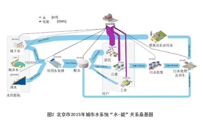 圖2所示給出了北京2015年水系統(tǒng)水量與能耗分配關(guān)系桑基圖,可以評估城市“水足跡”過程及能量消耗,在城市尺度上系統(tǒng)評估和多目標優(yōu)化“水-能”關(guān)系,通過水系統(tǒng)全流程過程系統(tǒng)規(guī)劃、聚焦水循環(huán)每個鏈條,進行傳統(tǒng)工藝改進、高效設(shè)備及革新性工藝技術(shù)應(yīng)用,尤其是對排水系統(tǒng)結(jié)構(gòu)優(yōu)化進而提升系統(tǒng)能源利用效率,因地制宜地采用污水中資源、能量回收以及清潔能源提取和利用等技術(shù)措施,進一步降低水系統(tǒng)能耗和溫室氣體排放,對于提升水系統(tǒng)韌性及可持續(xù)至關(guān)重要。