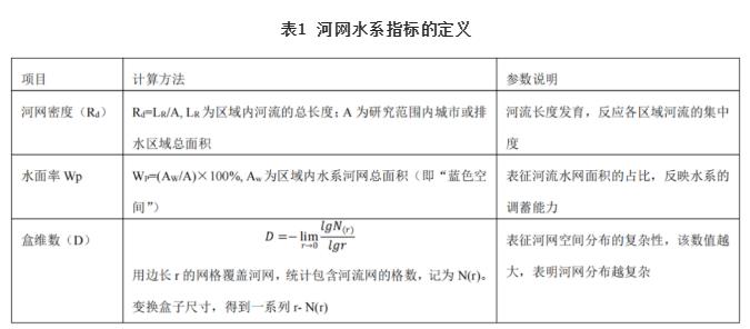 河網(wǎng)調(diào)蓄能力是水系在水文方面的重要功能之一,尤其在削減洪峰、降低洪水危害中具有重要的作用。受人類活動影響,尤其是近半個世紀年以來快速城鎮(zhèn)化引起的土地利用方式變化,致使許多城區(qū)河流、水塘、水淀區(qū)被掩埋甚至完全消失,導致城市水面率大幅減少,河網(wǎng)、水系發(fā)育及演變也表現(xiàn)出由復雜到簡單、由多元到單一的變化趨勢。世界范圍內(nèi)60%以上的河流受到城市化的影響,而城市化對河流生態(tài)完整性及生態(tài)功能造成了嚴重威脅;從國內(nèi)外經(jīng)驗看,這種演變無疑還會加劇洪澇災害、水質(zhì)惡化等問題。借助河道容蓄指標與水系結(jié)構(gòu)參數(shù)的相關(guān)關(guān)系分析河網(wǎng)結(jié)構(gòu)對調(diào)蓄能力的影響,常用的水系變化指標包括數(shù)量特征參數(shù)和復雜性參數(shù),選取河網(wǎng)密度(Rd)、水面率(WP)描述水系的數(shù)量特征,河網(wǎng)盒維數(shù)描述水系的復雜性特征,各指標計算方法及內(nèi)涵見表1。