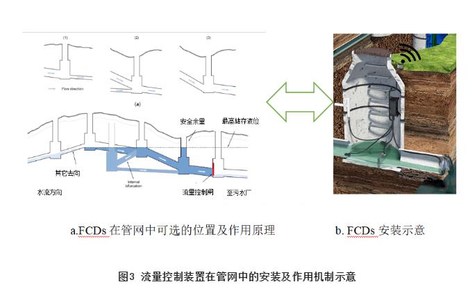國外的研究和實際案例表明,基于整個排水系統(tǒng)的拓撲結(jié)構(gòu),結(jié)合管網(wǎng)水力模擬等手段,選擇在管網(wǎng)關(guān)鍵節(jié)點處設(shè)置流量控制設(shè)備,通過布局策略、具體安裝數(shù)量和位置優(yōu)化,可以實現(xiàn)雨季對管網(wǎng)在線調(diào)蓄能力的充分利用,并實時減少CSO及下游管網(wǎng)的流量壓力,見圖3。我國室外排水設(shè)計標準缺少在城鎮(zhèn)排水管網(wǎng)適當位置設(shè)置流量控制調(diào)節(jié)設(shè)施、設(shè)備等方面的具體技術(shù)要求或建議,因此,實際項目設(shè)計往往沒有考慮對排水系統(tǒng)流量主動控制與優(yōu)化分配的必要性,導致暴雨期間無法實現(xiàn)對整個排水管網(wǎng)不同位置或區(qū)域的下泄流量和流速的有效控制,以及短時下游管網(wǎng)承受來自上游管網(wǎng)超量的流量沖擊進而使得下游排水區(qū)域的排水不暢、內(nèi)澇及CSO等現(xiàn)象,甚至在管網(wǎng)薄弱環(huán)節(jié)出現(xiàn)突發(fā)性的滿溢和洪澇災害;同時,由于管網(wǎng)中缺乏FCDs,不能充分發(fā)揮管網(wǎng)應(yīng)有的在線調(diào)蓄能力,對末端流量控制易造成瞬時沖擊和壓力。實際上,分布式的流量控制設(shè)備相對大規(guī)模灰色基礎(chǔ)設(shè)施建設(shè)更加經(jīng)濟、易于實施、可持續(xù),因此,改進傳統(tǒng)排水管網(wǎng)被動接收的排水模式,通過設(shè)置必要的在線流量控制裝置實現(xiàn)排水系統(tǒng)峰值流量管控,向“空間”換“時間”的主動控制方向轉(zhuǎn)變,對于增加汛期排洪防澇的靈活性、提升排水系統(tǒng)韌性和可靠性等方面至關(guān)重要。