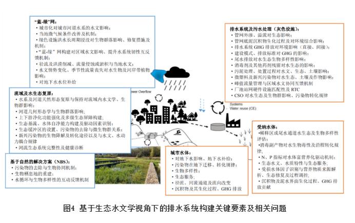 傳統(tǒng)城市排水系統(tǒng)的規(guī)劃、設(shè)計與實施環(huán)節(jié)可歸結(jié)為“水量”和“水質(zhì)”兩個維度,缺乏跨學科性且統(tǒng)籌不足,因此在規(guī)劃設(shè)計中融入生態(tài)水文措施可以彌補傳統(tǒng)排水設(shè)施的剛性缺欠。近年來,在“海綿城市”理念引領(lǐng)下,一些基于自然的解決方案(Nature-based solutions ,NBS) 得到應(yīng)用。盡管NBS是為特定目的而設(shè)計的(如城市排水),但它可以同時提供多種生態(tài)系統(tǒng)服務(wù),如雨水自然處理和滲濾、蒸發(fā)和生物多樣性保持等。通過對近些年的一些實踐案例調(diào)研發(fā)現(xiàn),個別具有“生態(tài)”特征的綠色基礎(chǔ)設(shè)施項目,從“現(xiàn)代生態(tài)水文學”角度來評價,則會發(fā)現(xiàn)其在城市水文、生物多樣性及水生態(tài)服務(wù)等維度上缺乏系統(tǒng)性統(tǒng)籌,因此,應(yīng)從排水系統(tǒng)或者全域水資源系統(tǒng)管理角度,充分考慮水的社會循環(huán)擾動對自然水文及生物多樣性的影響。城市級流域尺度上水系統(tǒng)不同要素之間的關(guān)聯(lián)及相互作用關(guān)系見圖4。