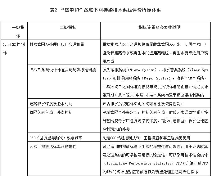 基于上述分析,“碳中和”格局下隨著氣候變化影響下不確定性天氣日益增加,水系統(tǒng)作為市政基礎(chǔ)設(shè)施要成為韌性城市總體規(guī)劃的重要組成部分,也要主動適應(yīng)不斷變化的外在環(huán)境壓力及相關(guān)條件的約束而不斷調(diào)整和優(yōu)化框架、技術(shù)和管理體系;從另一角度看,低碳既是水系統(tǒng)面臨的壓力,更是給水務(wù)和環(huán)境行業(yè)帶來了新的技術(shù)發(fā)展驅(qū)動力、商業(yè)模式創(chuàng)新和發(fā)展機遇。水務(wù)行業(yè)要系統(tǒng)性構(gòu)建以韌性、可靠性與可持續(xù)性為基本特征的面向未來的城鎮(zhèn)排水系統(tǒng)框架,至關(guān)重要的問題是,可持續(xù)城市排水系統(tǒng)構(gòu)建需要跨學科、跨部門的協(xié)作和共同實踐,問題在于所涉及的社會和技術(shù)復雜性,以及對水系統(tǒng)面臨的綜合挑戰(zhàn)和系統(tǒng)解決方案的范圍缺乏共同的理解和認知,推進可持續(xù)排水系統(tǒng)的構(gòu)建不是一件容易的事情。目前,國內(nèi)外尚缺乏“碳中和”戰(zhàn)略下可持續(xù)排水系統(tǒng)評價指標體系,為此將系統(tǒng)可靠性、韌性、低碳、生態(tài)安全性、智慧監(jiān)測與控制及非工程性措施與利益相關(guān)方的積極參與六個維度設(shè)置為一級指標,在一級指標基礎(chǔ)上細化為47項二級指標,具體見表2。需要說明的是,不同指標之間可能會存在一些內(nèi)在的邏輯關(guān)系和相互影響,但是排水系統(tǒng)本身就是一個多維度、多層次、多因素、多目標復雜交織的體系,需要各個專業(yè)的共同協(xié)作和推進。