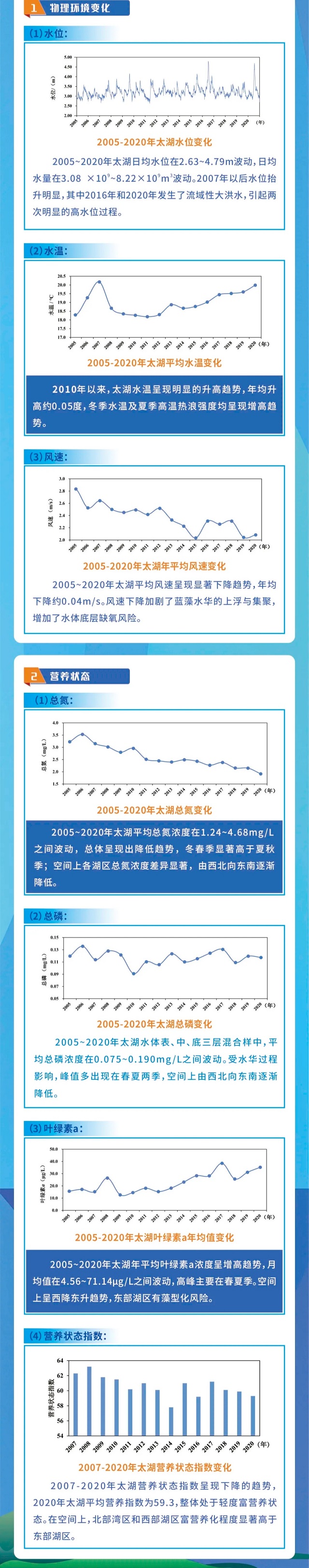 15年間,太湖物理環(huán)境變化顯著。其中水位變化方面,2005——2020年間,太湖日均水位在2.63——4.79m波動(dòng),日均水量在3.08×10?~8.22×10?m3波動(dòng)。2007年以后水位抬升明顯,其中2016年和2020年發(fā)生了流域性大洪水,引起兩次明顯的高水位過程;平均水溫變化方面,2010年以來,太湖水溫呈現(xiàn)明顯的升高趨勢(shì),年均升高約0.05℃,冬季水溫及夏季高溫?zé)崂藦?qiáng)度均呈現(xiàn)增高趨勢(shì);平均風(fēng)速變化方面,2005——2020年太湖平均風(fēng)速呈現(xiàn)顯著下降趨勢(shì),年均下降約0.04m/s。風(fēng)速下降加劇了藍(lán)藻水華的上浮與集聚,增加了水體底層缺氧風(fēng)險(xiǎn)。