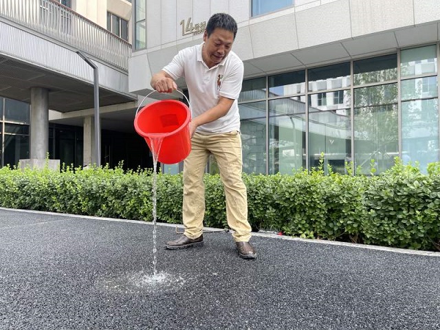 近年來,透水磚、滲水路面得到廣泛使用,在石景山保險(xiǎn)產(chǎn)業(yè)園也同樣如此。園區(qū)暖通工程師那會(huì)義向記者展示了路面滲水試驗(yàn)。那會(huì)義拎來一大桶水, 沖著路面倒了下去。記者看到,雖然水流流速很快,但路面就像干燥的海綿,可以把水快速吸干,一點(diǎn)兒積水都沒有。