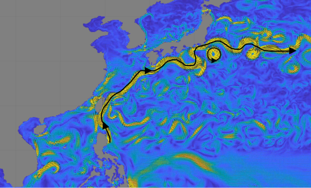 北太平洋環(huán)流的主要結(jié)構(gòu)為一個(gè)順時(shí)針環(huán)流,在福島附近起主導(dǎo)作用的是黑潮(著名洋流,因??深藍(lán)似???得名),黑潮在離開(kāi)日本后,主要向東流動(dòng),所以核污染水的主要擴(kuò)散方向是向東。