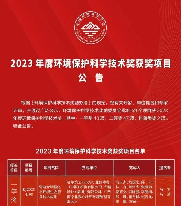 2023年12月25日,中國(guó)環(huán)境科學(xué)學(xué)會(huì)發(fā)布《2023年度環(huán)境保護(hù)科學(xué)技術(shù)獎(jiǎng)獲獎(jiǎng)項(xiàng)目公告》,北控水務(wù)參與申報(bào)的“弱電介導(dǎo)強(qiáng)化水環(huán)境生態(tài)修復(fù)技術(shù)應(yīng)用”榮獲一等獎(jiǎng)。本次共批準(zhǔn)59個(gè)項(xiàng)目,其中一等獎(jiǎng)10項(xiàng),二等獎(jiǎng)47項(xiàng),科普類(lèi)獎(jiǎng)2項(xiàng)。