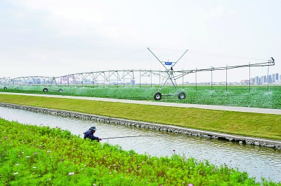 浙江舟山市岱山島,平移式噴灌機(jī)在由鹽田改造而成的農(nóng)業(yè)產(chǎn)業(yè)園中作業(yè)。新華社發(fā)