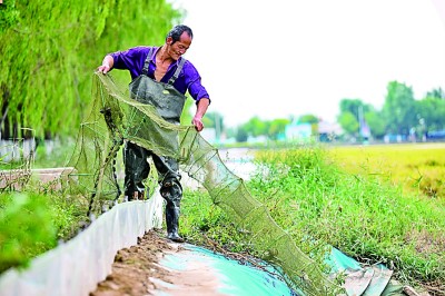 寧夏賀蘭縣立崗鎮(zhèn)永興村,在由鹽堿地改造而成的稻田中,工作人員在收獲稻田蟹。新華社發(fā)