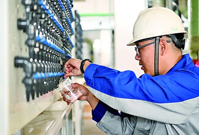 天津南港工業(yè)區(qū)一海水淡化主裝置生產(chǎn)車(chē)間內(nèi),工作人員在取樣淡水。新華社發(fā)