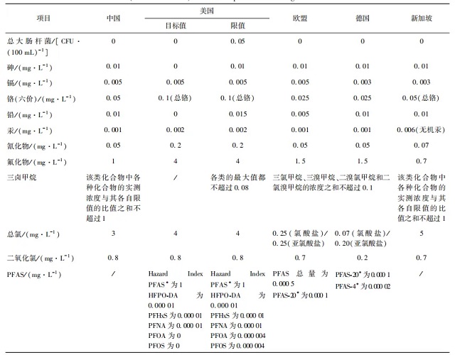 注:?表示美國(guó)標(biāo)準(zhǔn)中一種基于健康風(fēng)險(xiǎn)的水質(zhì)目標(biāo)值,是理論上的“無(wú)風(fēng)險(xiǎn)”濃度水平,對(duì)所有人群(包括敏感人群,如兒童和免疫力低下者)都沒(méi)有已知或預(yù)期的健康風(fēng)險(xiǎn);HazardIndexPFAS表示美國(guó)標(biāo)準(zhǔn)中20種PFAS化學(xué)物質(zhì)的集合;PFAS-4是指包括PFOA、PFNA、PFHxS和PFOS等4種PFAS化學(xué)物質(zhì)的集合。