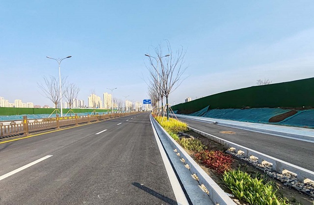 經(jīng)過(guò)施工人員的奮戰(zhàn),這一段道路快車道已完成瀝青鋪設(shè)及路面標(biāo)線、路牌等配套工作,目前僅剩下西段慢車道的面層瀝青還沒(méi)有鋪設(shè),綠化人員正在進(jìn)行配套綠化施工……整個(gè)工程已基本建成,開始進(jìn)入掃尾階段。