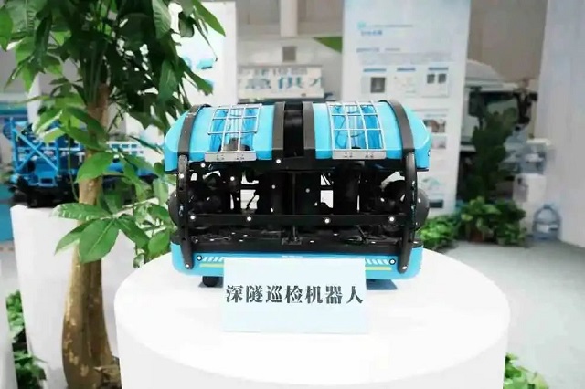中建三局綠投公司參展的深隧巡檢機器人已應(yīng)用于武漢大東湖深隧工程,能夠在高水位、多障礙物等復(fù)雜環(huán)境下,實現(xiàn)準確定向、定位、懸停等操作,最大工作水深100米,最長檢測距離4.5公里,最大抗流能力1.2米每秒,創(chuàng)新集成聲、光、電磁三位一體檢測系統(tǒng),對隧道內(nèi)部厘米級厚度淤積和毫米級結(jié)構(gòu)表面損傷進行檢測,檢測精度達90%以上,保障深隧安全穩(wěn)定運營