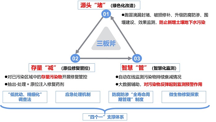 圖為忠信化工“三板斧”土壤和地下水污染源頭管控和風(fēng)險(xiǎn)防控技術(shù)體系。