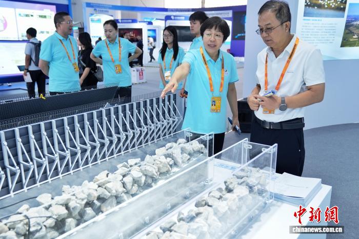 9月11日,在北京舉行的2025年服貿會北京水務科技創新展區,觀眾了解堆石混凝土壩構造模型。據了解,該展區總面積超800平方米,設置濱水空間、數智水務、健康水業及水利水電工程建設四大板塊,集中展示北京水務在科技領域的技術突破與示范應用。中新社記者張祥毅攝