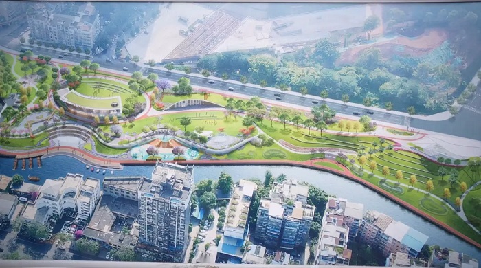 該公園占地約3萬平方米,建設內容涵蓋親水碼頭、海綿型公園綠地、慢跑步道、雨水花園、音樂噴泉、親水廣場、淺灘戲水區等,配套2個城市驛站與1個兒童活動區。項目自今年1月起打圍施工,目前親水碼頭主體已完工,公園總體施工完成30%。